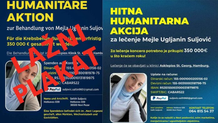 Dok traje akcija prikupljanja 350.000 € za liječenje Mejle Ugljanin Suljović u klinici Asklepios St. Georg, Hamburg, društvenim mrežama u Njemačkoj širi se falsifikovani plakat na njemačkom jeziku sa drugačijim računima i tuđim PayPal nalogom. Organizatori i porodica upozoravaju da je riječ o klasičnoj prevari i pozivaju građane da uplate vrše isključivo na zvanične račune.