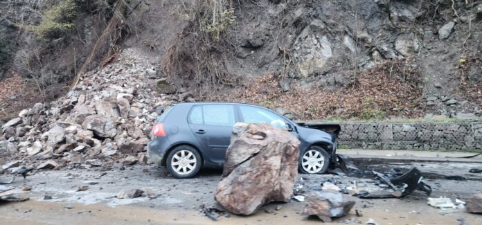 Na jednoj od najkritičnijih deonica Ibarske magistrale, u blizini Baljevca između Ušća i Raške, jutros se odigrala dramatična scena kada se ogromna stijena odvalila sa litice i obrušila direktno na put, pogodivši u pokretu automobil marke Volkswagen Golf. Snimci sa terena pokazuju zastrašujući prizor – razvaljena stijena na sred puta, desetine rasutih komada kamenja i automobil sa potpuno uništenom prednjom stranom.