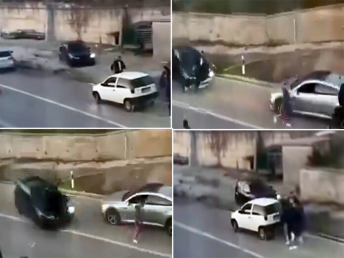 Na snimku se vidi trenutak kada jedan od muškaraca ulazi ponovo u svoj automobil i velikom brzinom kreće prema grupi ljudi, koji se u panici razbježe.
