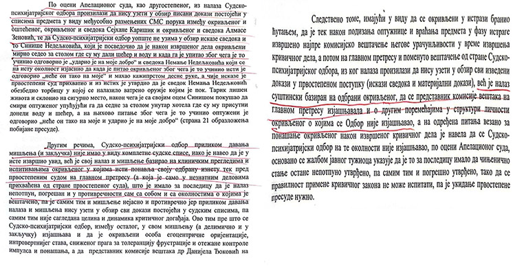 Iz dostavljenog sadržaja presude vidljivo je da je Apelacioni sud utvrdio niz ozbiljnih propusta. Sud ističe da prvostepeno vijeće nije uzelo u obzir materijalne dokaze koji postoje u sudskom spisu, poput SMS komunikacije između optuženog, Tarika Hasanovića i svjedokinja, kao ni ključna svjedočenja – posebno Nemanje Nedeljkovića i Almasa Zenovića. Istovremeno, Sudsko-psihijatrijski odbor je dao nalaz koji se pokazao nepotpunim i protivrječnim, jer je zasnovan isključivo na kliničkom ispitivanju optuženog, dok se komisija nije izjašnjavala o mnogim ponašajnim aspektima optuženog, uprkos tome što je predstavnik komisije na glavnom pretresu govorio o „drugim poremećajima ličnosti“, što se nije nalazilo u pisanom vještačenju. Apelacioni sud ocjenjuje da komisija nije imala uvid u kompletne sudske spise i da njen nalaz ne odražava cjelinu događaja, niti dinamiku kritične noći. Zbog takvog pristupa, nalaz je okarakterisan kao nejasan, protivrečan i neprihvatljiv kao osnov za presuđenje.