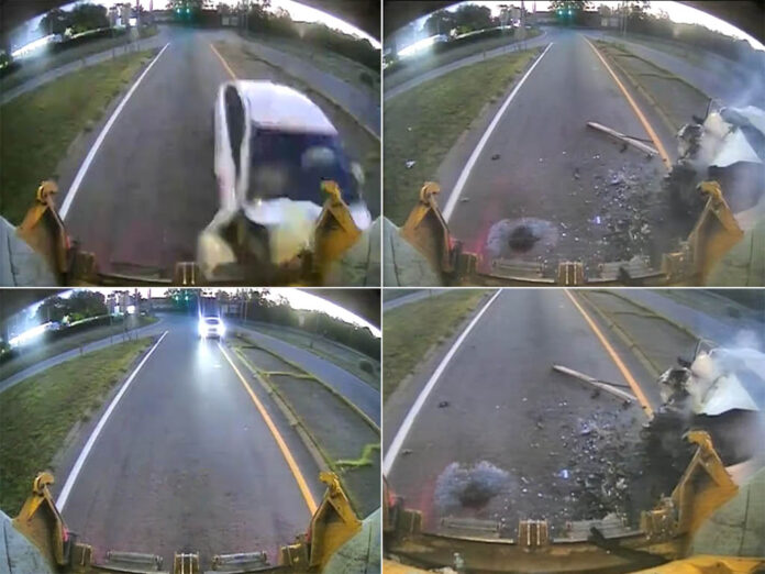 Kamera postavljena na kamionu zabilježila je trenutak udara: vozilo se u djeliću sekunde zabija u masivni kamion i potpuno se raspada, ostavljajući za sobom gomilu olupine i dim.