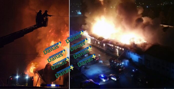 NOVI PAZAR – Ogroman požar koji je izbio u ulici Dimitrija Tucovića i dalje pravi veliku štetu, a video snimak sa zadnje strane industrijskog kompleksa jasno pokazuje koliko je objekata istovremeno zahvaćeno vatrom. Plamen je progutao fabriku EMA-TEX, kamenjaru Musić, kao i više magacina i skladišta repromaterijala, dok se gust dim širi cijelim područjem.