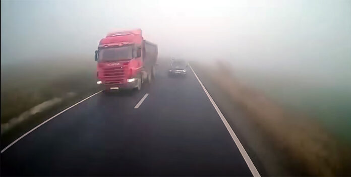 Na društvenim mrežama pojavila se dramatična snimka saobraćajne nesreće koja se dogodila na cesti prekrivenoj gustom maglom. Na snimku se jasno vidi kako automobil pokušava preteći kamion, ali pritom ulazi u suprotnu traku, gdje dolazi do direktnog sudara s vozilom iz suprotnog smjera.
