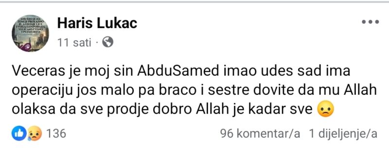 - „Večeras je moj sin AbduSamed imao udes, sad ima operaciju još malo, pa braćo i sestre, dovite da mu Allah olakša da sve prođe dobro. Allah je kadar sve“, napisao je Haris Lukač u emotivnoj objavi koja je izazvala brojne reakcije i poruke podrške.